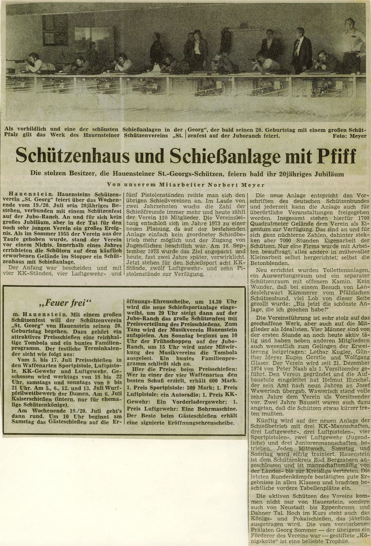 Anfang der 70er Jahre hatte der Verein seine Schulden größtenteils getilgt und sogar einen finanziellen Grundstock für kommende Aufgaben geschaffen. Auch an das Gelände des Schützenvereins angrenzende Grundstücke waren bereits erworben. Für den mit steigender Mitgliederzahl zunehmenden Schießbetrieb reichte die vorhandene Anlage nicht mehr aus, und so beschloss man bereits 1970, Baupläne für eine Standerweiterung auszuarbeiten, die dann 1973 von der Hauptversammlung gebilligt wurden. Nach entbehrungsreichen zwei Jahren Bauzeit konnten die HauensteinerSt.-Georgs-Schützen 1975 zu ihrem 20-jährigem Jubiläum eine der schönsten Schießanlagen in der Pfalz in Betrieb nehmen.Die “Rheinpfalz” veröffentlichte am 03. Juli 1975 den Bericht: Schützenhaus und Schießanlage mit PfiffNach diesem ”Kraftakt” folgten Jahre der Konsolidierung und Konzentration auf den Schießsport, für den man nun ja optimale Bedingungen geschaffen hatte. 30 Schützen konnten nun gleichzeitig ihrem geliebten Sport nachgehen, eine Kapazität, die sich bis heute als ausreichend erwiesen hat.Nächster Höhepunkt in der Vereinsgeschichte waren die Feierlichkeiten zum 25-jährigen Jubiläum. Unvergessen bleiben die Totenehrungen mit Kranzniederlegung und Salutsalven am Ehrenmal und die Schubertmesse auf der mit 1500 Menschen voll besetzten Juboranch. Die vom damaligen Vereinsvorstand Wolfgang Glaser und dem 2. Vorsitzenden Theo Feith organisierte Veranstaltung war nicht nur für den Schützenverein St. Georg ein toller Erfolg, sondern erbrachte auch die stattliche Summe von 1207.- DM für das Behindertenwerk von Pfarrer Kimmle.Im April 1982 richtete unser Verein die Generalversammlung des Pfälzischen Sportschützenbundes aus. 550 Delegierte aus der gesamten Pfalz nahmen an dieser Veranstaltung in der Wasgau-Sporthalle Hauenstein teil.Mitte der 80er Jahre zählte man ca. 140 Mitglieder. Die Schützen aus Hauenstein waren in vielen Disziplinen aktiv und erfolgreich, und auch eine sehenswerte Jugendabteilung war aufgebaut worden. Nun war es an der Zeit, die Trainings- und Wettkampfbedingungen auf dem Luftdruckwaffenstand zu verbessern. Bisher schoss man “ins Freie” und die Schießleistungen wurden von Witterungsbedingungen und wechselnden Lichtverhältnissen beeinflusst. Dies verbesserte eine Überdachung. Gleichzeitig rückten die Schießstände um 5m nach vorn - die Option, mit Zimmerstutzen zu schießen, wurde damit aufgegeben - , wodurch mehr Platz hinter den Schützen z.B. für Zuschauer entstand. Mit elektrischen Zuganlagen ausgerüstet, war die 10m-Halle nun fast perfekt. Auf der Jahreshauptversammlung 1988 wurde Theo Feith zum 1. Vorsitzenden gewählt. Er löste damit Wolfgang Glaser, der nicht mehr kandidierte, nach 12-jähriger Amtszeit ab.Neben der ohnehin immer anfallenden Instandsetzungsarbeiten an der Schießanlage und der Modernisierung des Auswertungsraumes standen nun auch umfangreiche Arbeiten in der Gastwirtschaft an. Mit hohem finanziellem Aufwand wurde 1992/1993 die Küche komplett neu gebaut und eingerichtet, um so optimale Voraussetzungen für die jeweiligen Pächter zu schaffen. Die Einnahmen aus der Vermietung der Gaststätte waren immer ein wesentlicher Bestandteil im Finanzplan des Schützenvereins.Als der Schützenverein St. Georg Hauenstein 1995 sein 40-jähriges Bestehen feierte, hatte er schon 170 Mitglieder und nahm mit 11 Mannschaften an Rundenkämpfen teil, wobei die 1. Luftpistolenmannschft sogar in der Oberliga, der damals höchsten Klasse im DSB startete. Auf unzählige Erfolge bei Kreis-, Bezirks- und Landesmeisterschaften konnte man zurückblicken. Der Verein war schuldenfrei und stolzer Besitzer einer Fläche von rund 8000 m².In den folgenden Jahren musste die Schießanlage durch mehrere Modernisierungsmaßnahmen auf einem zeitgemäßen Stand gehalten werden. Zum Beispiel erhielten die KK-Zuganlagen eine elektronische Steuerung, und der Sportpistolenstand wurde mit einer Schalldämmung versehen, um nicht durch das neu ins Programm genommene Schießen mit Großkaliberkurzwaffen Probleme mit Geräuschemissionen zu bekommen. Eine Auswertmaschine wurde angeschafft, vor allem aber mussten Rücklagen gebildet werden für das nächste Großprojekt, die unausweichliche Sanierung des kompletten Daches.2001 beauftragte man eine Dachdeckerfirma mit der Erneuerung der Dächer von Gaststätte und Schießanlage, und durch viel Eigenleistung der Vereinsmitglieder sollten die Kosten möglichst niedrig gehalten werden. Dadurch, mit Hilfe von Zuschüssen verschiedenster Organisationen und dank der vorausschauenden Finanzplanung der Vereinsführung war keine Verschuldung des Vereins erforderlich.Auf der Jahreshauptversammlung 2005 stellte Theo Feith nach 26-jähriger Tätigkeit im Vorstand des Schützenvereins - davon 14 Jahre als erster Vorsitzender - aus gesundheitlichen Gründen sein Amt zur Verfügung. Er wurde 2003 zum Ehrenvorsitzenden ernannt. Die Versammlung wählte Gerhard Bischoff zum ersten Vorsitzenden, der dieses Amt bis heute bekleidet.Zum 50. Jubiläum im Jahre 2005 wurde die gesamte Schießanlage in vielen Arbeitseinsätzen herausgeputzt. Der KK-Stand bekam neue Pritschen, der 10m-Stand neue elektrische Zuganlagen, und die Gebäude wurden innen und außen mit einem neuen Anstrich versehen.